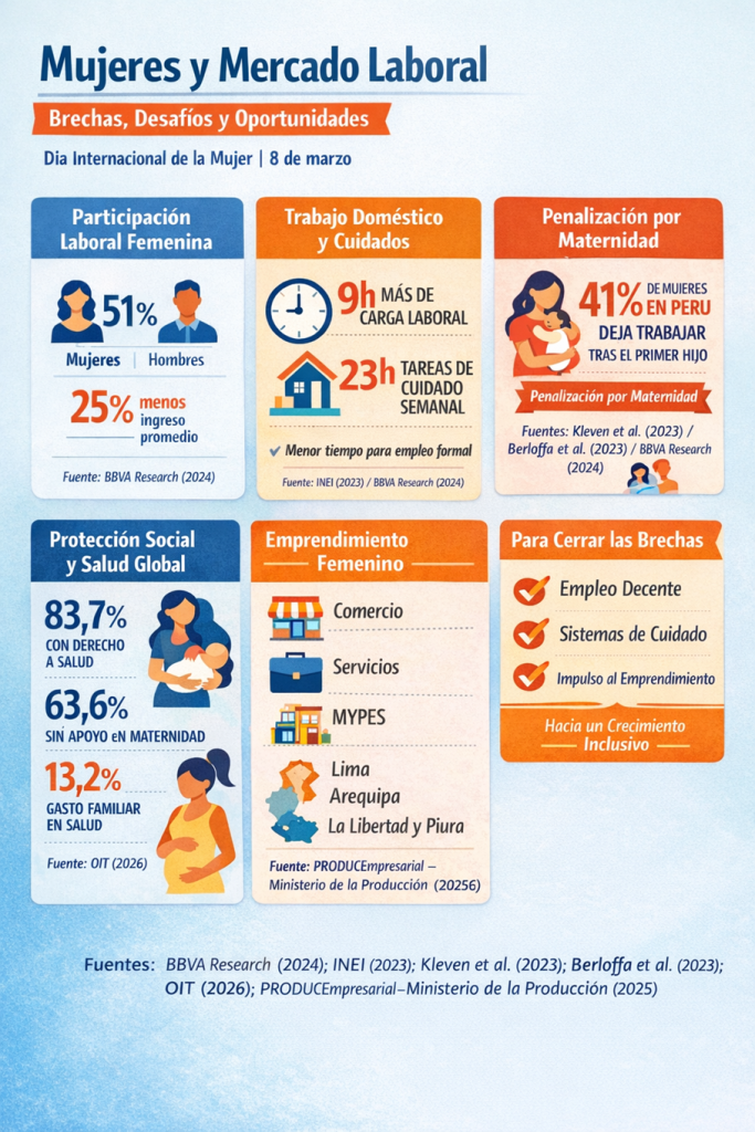 En el caso del Perú, la evidencia también muestra importantes brechas en el acceso al empleo y en la calidad de las condiciones laborales. Los informes recientes sobre tendencias del empleo indican que las mujeres se concentran con mayor frecuencia en sectores caracterizados por altos niveles de informalidad y baja cobertura de seguridad social. A ello se suma el peso del trabajo de cuidados no remunerado, que continúa siendo una de las principales limitaciones para su inserción laboral y su desarrollo profesional.