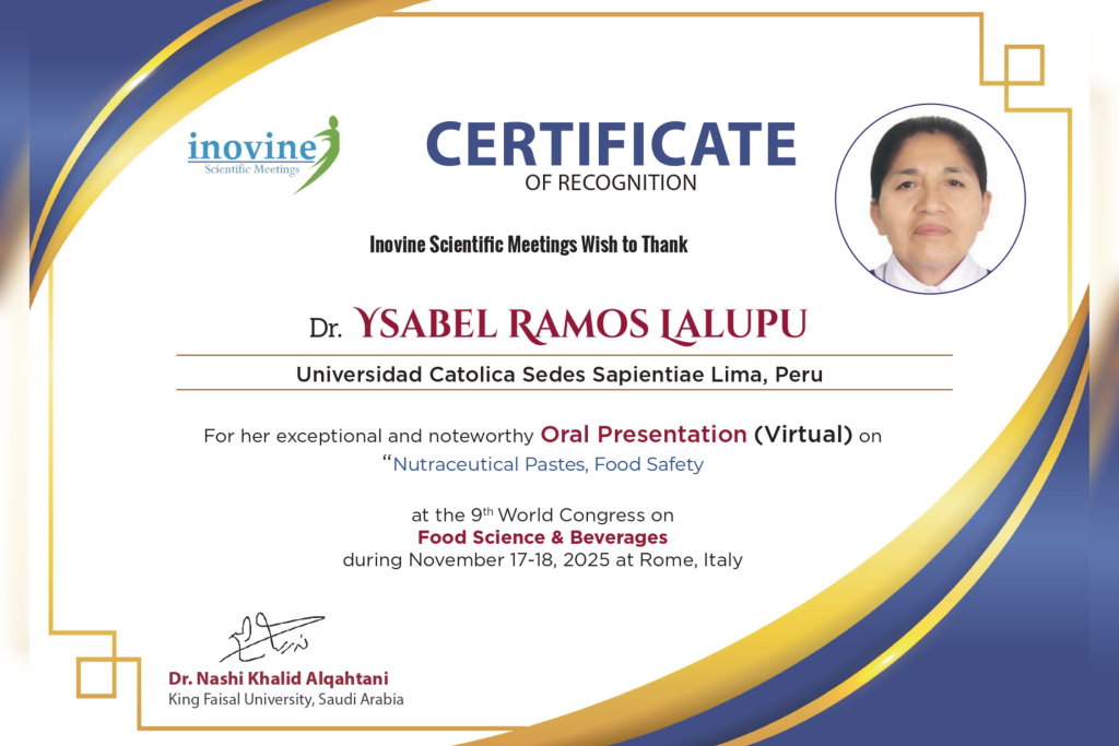 En el marco de su participación, la UCSS, a través de la Dra. Ramos, recibió un diploma de reconocimiento otorgado por el organizador del congreso, Inovine Scientific Meetings, en mérito a su destacada intervención. Asimismo, se le concedieron 16 créditos de investigación científica por una universidad de Estados Unidos, como parte de su formación en un postdoctorado en investigación científica en innovación alimentaria.