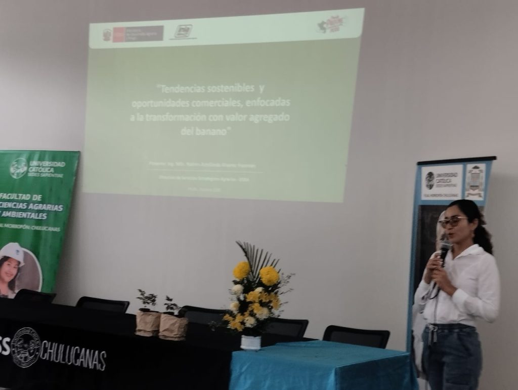 Posteriormente, la MSc. Ing. Katrin Álvarez Huamán, representante del INIA, expuso sobre “Tendencias sostenibles y oportunidades comerciales, enfocadas a la transformación con valor agregado del banano”, resaltando las oportunidades de mercado y los desafíos del sector frente a los estándares internacionales de sostenibilidad.