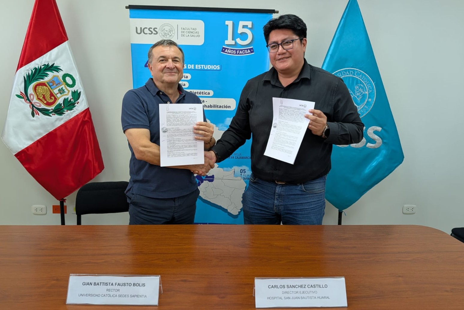 La Facultad de Ciencias de la Salud (FCS) de la Universidad Católica Sedes Sapientiae (UCSS) suscribió un convenio de cooperación con el Hospital “San Juan Bautista” de Huaral, con el objetivo de fortalecer la formación académica y profesional de sus estudiantes. La firma del acuerdo se realizó el pasado 27 de marzo en las instalaciones del campus principal de Lima.