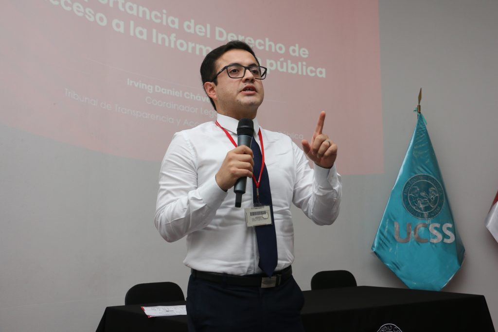 A continuación, Irving Chávez, coordinador legal del Tribunal de Transparencia y Acceso a la Información Pública del MINJUSDH, presentó la ponencia “Importancia de la Transparencia y Acceso a la Información Pública”. Su intervención enfatizó el valor de la transparencia como pilar fundamental para el fortalecimiento de la democracia y la participación ciudadana.