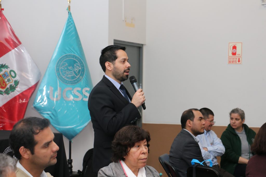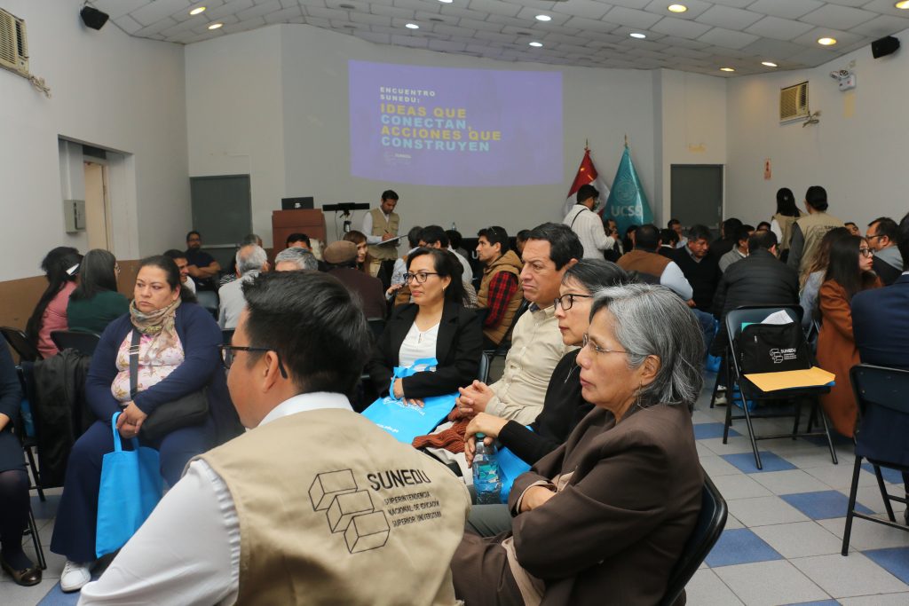 En el auditorio del Local Central de la UCSS se desarrolló la mesa de trabajo con la Superintendencia Nacional de Educación Superior Universitaria (SUNEDU), bajo el lema “Ideas que conectan, acciones que construyen”. Adicionalmente, el evento fue transmitido por Zoom, permitiendo la participación de las diferentes filiales de la universidad.
