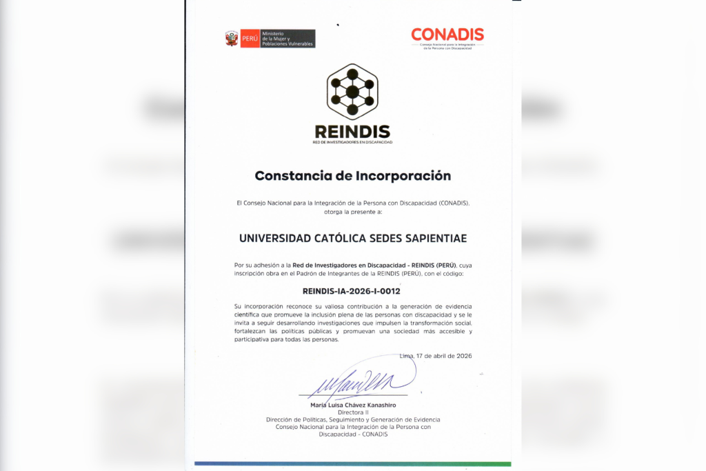 El pasado viernes 17 de abril, la Universidad Católica Sedes Sapientiae (UCSS) participó en la ceremonia de incorporación a la Red Nacional de Investigadores en Discapacidad (REINDIS Perú), consolidando así su compromiso institucional con la investigación y la promoción de los derechos de las personas con discapacidad. En dicha ceremonia estuvo presente la Lic. Mercedes Villalobos, presidente del Consejo Nacional para la Integración de la Persona con Discapacidad (Conadis).