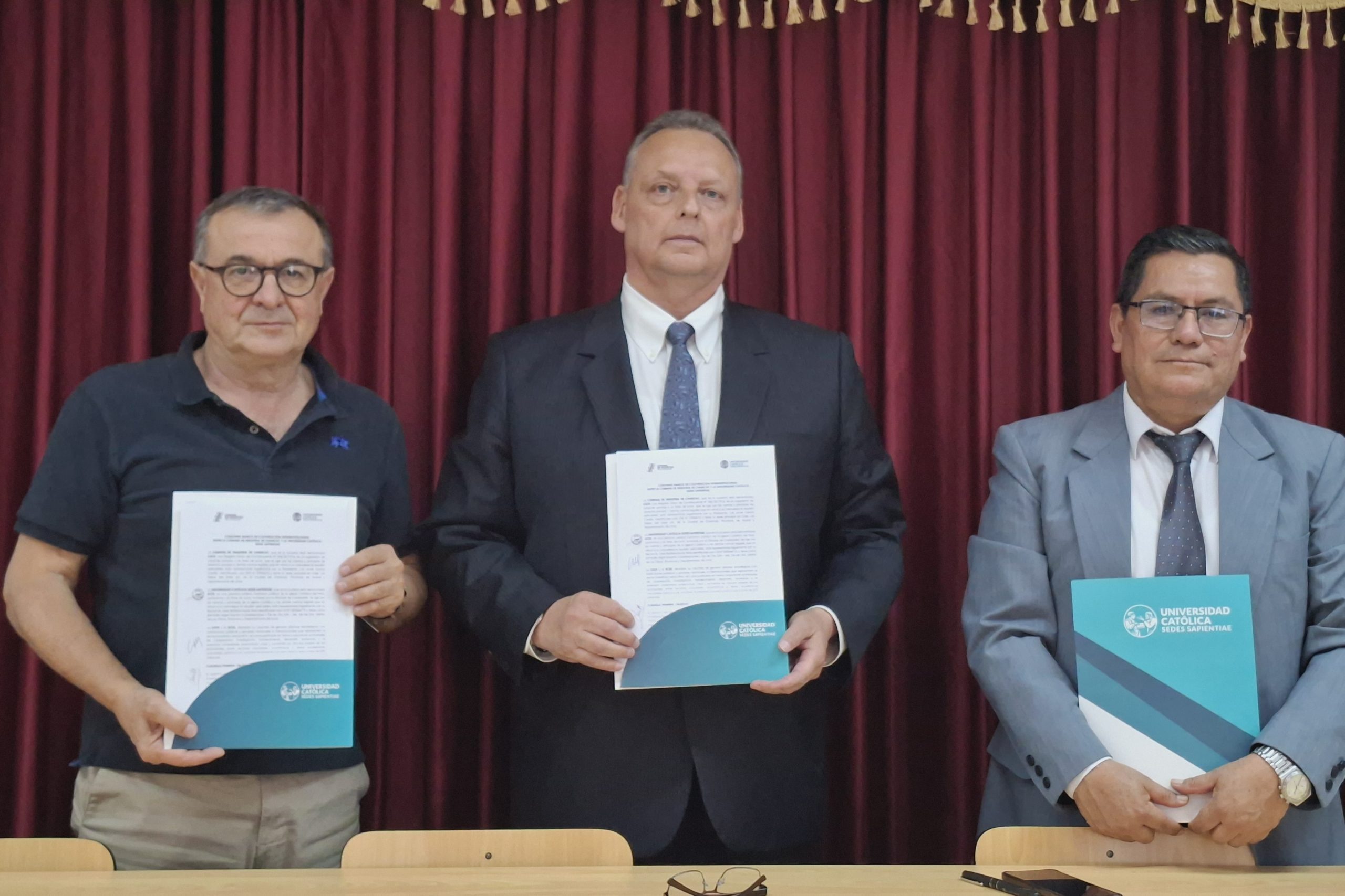 El pasado 13 de noviembre se llevó a cabo la firma del Convenio Marco de Cooperación Institucional entre la Cámara de Industria de Chancay y la Universidad Católica Sedes Sapientiae (UCSS). La ceremonia reunió al Sr. Luis Javier García Carrillo, presidente de la Cámara de Industria de Chancay; al rector de la UCSS, Dr. Gian Battista Bolis; y al decano de la Facultad de Derecho y Ciencias Políticas (FDCP), Mtro. Edgar Cruz, quienes oficializaron un acuerdo orientado a fortalecer el vínculo entre la academia y el sector industrial.
